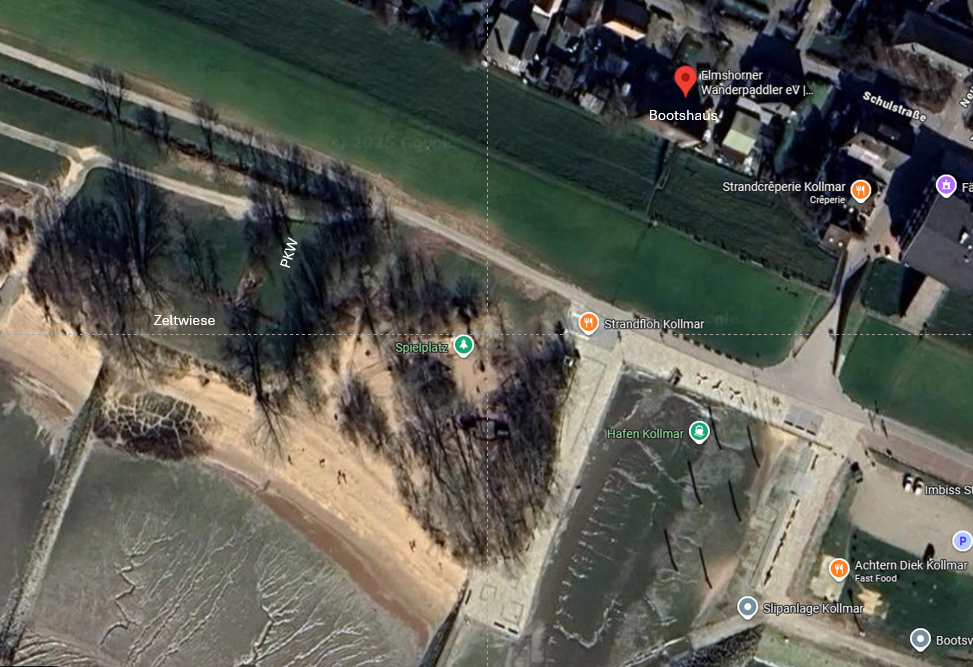 Die Zeltwiese liegt vom Wasser aus betrachtet flussabwärts nach dem Kollmarer Hafen, am Strand ist ein kleiner Durchgang zur Zeltwiese, eher links vom Wasser aus betrachtet in der ersten Bucht nach dem Hafen.